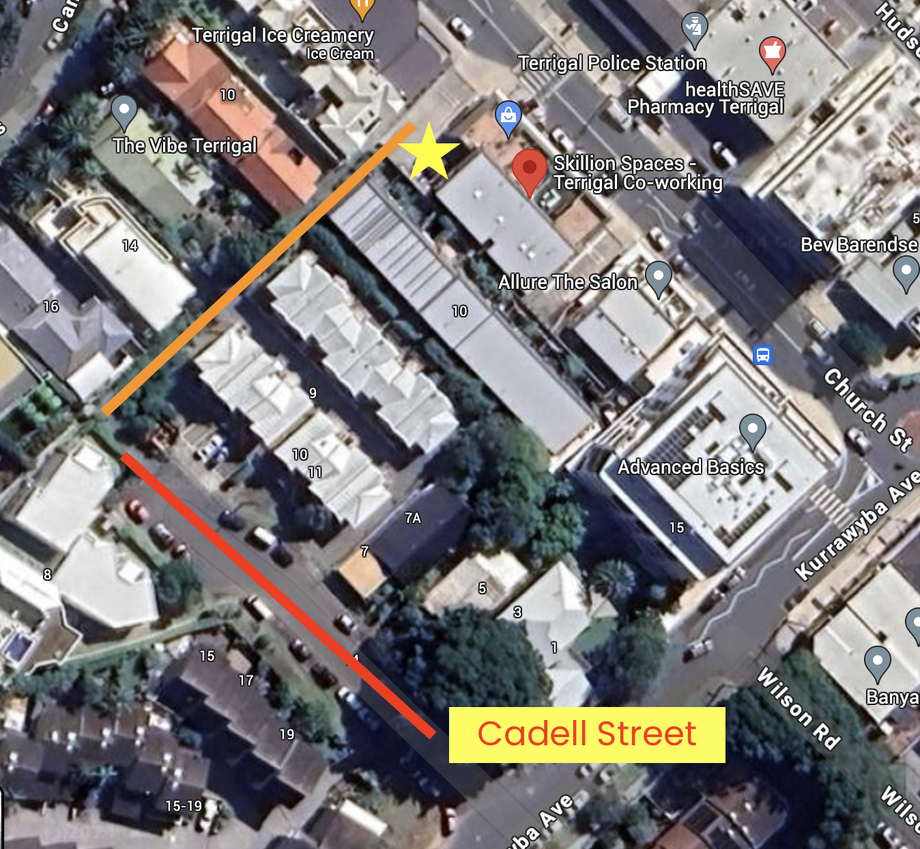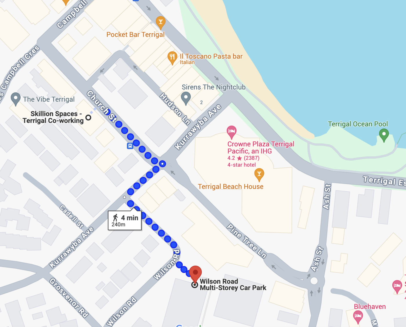 Another convenient option, often with more space and within a minute walk, is on Cadell Street Terrigal. A small pedestrian path leads from Cadell Street down towards Terrigal, right past the entry of Skillion Spaces.
