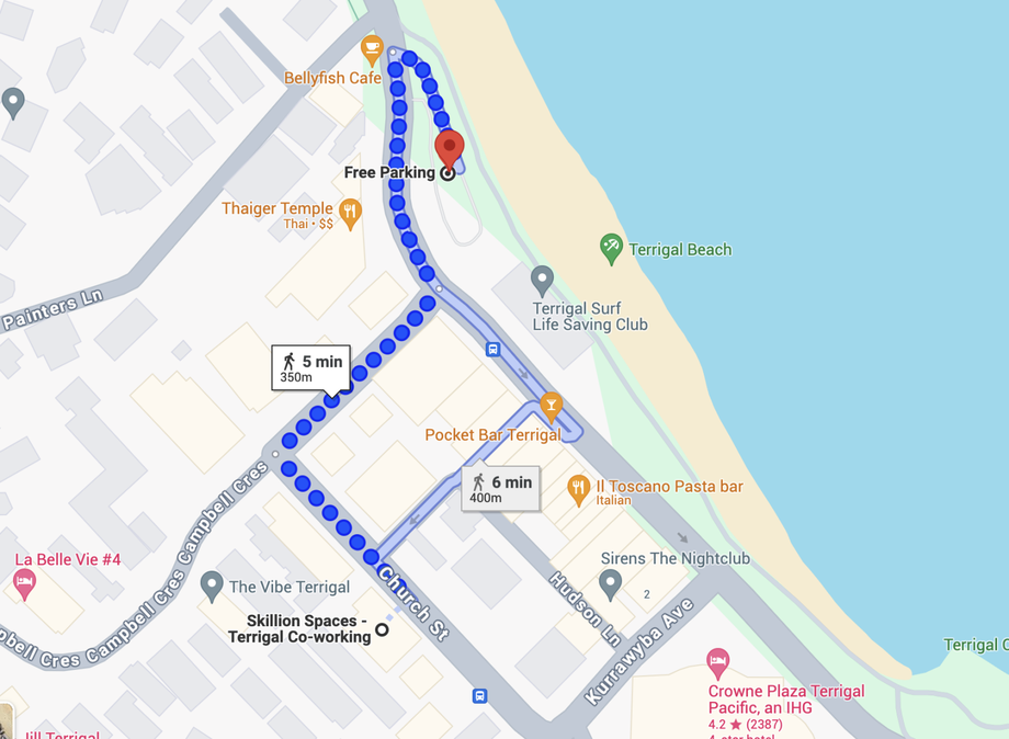 Terrigal has street parking on most streets, though it can become busy. Note that most areas have time limitations (e.g. the street side parking immediately in front of Skillion Spaces on Church Street has 1P parking between 0830-1800 weekdays.