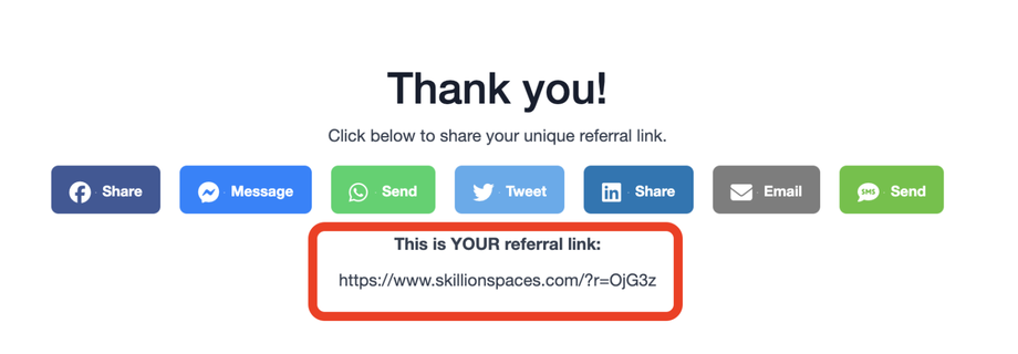 When you enter your details, a "Thank You" message will appear with easy sharing links, and your unique URL to pass along (see the example below inside the red box).